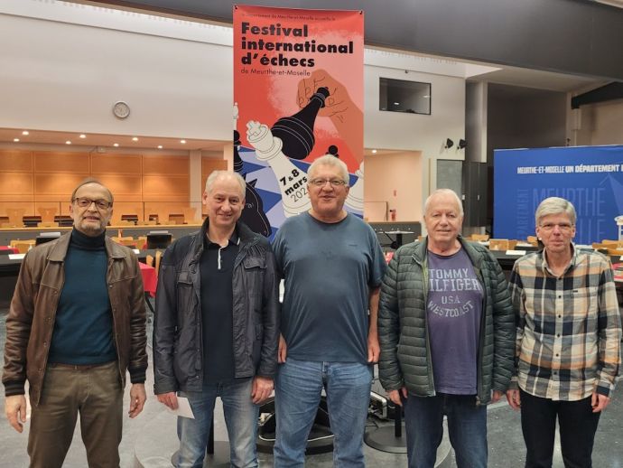 Zweiter Platz beim Blitzschachturnier in Nancy: Die "Untergrombach Seniors" mit IM Heinz Fuchs (zweiter von links), IM Christian Maier, FM Hans-Joachim Vatter und FM Thomas Raupp (alle rechts daneben)