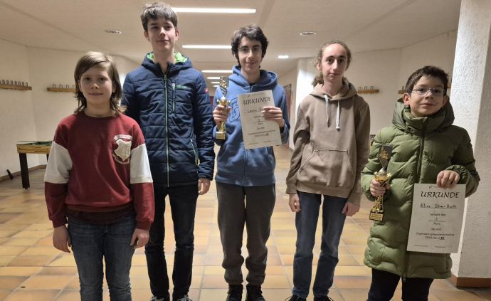 Vergangenes Wochenende fanden die Bezirksjugendeinzelmeisterschaften in Ettlingen statt. Niels Gade wurde Bezirksmeister in der Altersklasse U18 und spielt Anfang Januar die Badischen Jugendeinzelmeisterschaften mit. In der Klasse U18 bis U25 wurde Tim Burkhardt fünfter und sprang über DWZ 1700. In der U16 wurde Levin Uyar Vizemeister mit 4,5 aus 5 Punkten, ohne die Gelegenheit gehabt zu haben, gegen den Turniersieger spielen zu können. Vielleicht sollte man das Auslosungsformat überdenken bei nur fünf Runden und im nächsten Jahr das beschleunigte Schweizer System einsetzen. Uyar darf aber auf einen Freiplatz bei den Badischen Meisterschaften hoffen. Leon Shapiro spielte in der U16 auch ein gutes Turnier und knackte die Marke 1600 DWZ. In der U14 endeten Marek Tritschler, Miran Atca und Lionel Mayer im Mittelfeld, besonders für Lionel Mayer ein großer Erfolg. Unser Neuzugang steigt gleich mit DWZ 933 ein, spielt aber schon deutlich stärker. Die U10 und U12 wurden zusammengelegt, Elias Blum-Barth holte den zweiten Rang in der U10 und darf ebenfalls hoffnungsvoll einen Freiplatzantrag zu den Badischen Meisterschaften stellen. Krishna Thotli wurde Fünfter in der U12. Insgesamt war es ein sehr erfreuliches Turnier aus Untergrombacher Sicht.