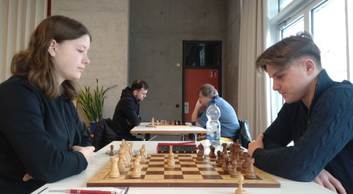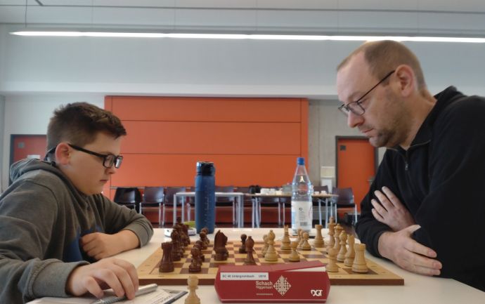 Zum Abschluss des Spieltags gab es dann noch etwas Tragik. Levin Wettstein erwies sich mit Schwarz gegen das gefährliche Evans-Gambit sattelfest in der Theorie und erspielte klaren Vorteil aus der Eröffnung heraus. Im Bestreben zur Vereinfachung und Mitnahme des materiellen Vorteils unterliefen dem jungen Untergrombacher aber Ungenauigkeiten, die Weiß nutzen konnte, dennoch war auch im Mittelspiel die schwarze Stellung zu bevorzugen. Nach einigem Lavieren hatte Wettstein dann die Chance zum Tausch der Türme, wollte aber einen Zug vor der Zeitkontrolle besonders schön spielen und übersah dabei einen zweizügigen Figurenverlust durch Doppelangriff. Diese Gelegenheit ließ sich der erfahrene Karlsruher nicht entgehen undd drehte den Spielverlauf auf den Kopf.