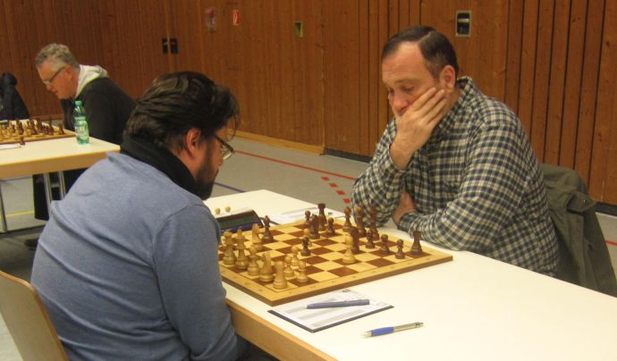 Titelverteidiger GM Vyacheslav Ikonnikov (links) hatte etwas Arbeit, aber die Partie jederzeit unter Kontrolle gegen Bernd Giacomelli (SK Durlach)