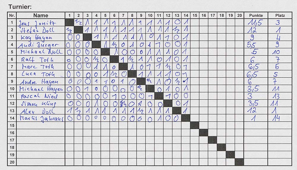 Rang | Spieler | DWZ | Punkte | S | R | V | Gesamt- wertung |