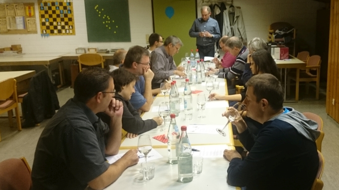 Am 18.9. fand eine von Heinz Fuchs organisierte Weinprobe im SC Untergrombach statt. Die dabei verkosteten edlen Weißweine wurden von Heinz Fuchs gespendet, die Gebühr der Teilnehmer ging als Spende in die Kasse des Schach-Clubs. Der Organisator, der auch Vorsitzender des Vereins für Weinkultur Kraichtal ist, glänzte dabei mit profunder Sachkenntnis und konnte wirklich jede Frage zum Thema kompetent erläutern.