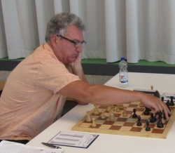 Auf dem Bild spielt er den entscheidenden Schlag in einer ganz starken Zweitligapartie gegen einen Großmeister, an die er sich gerne erinnern wird.