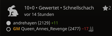 Der Untergrombacher Jugendspieler Andre Hayen schlug in einer Schnellschachpartie auf lichess einen starken russischen Großmeister. Der Sieg ist doppelt bemerkenswert, weil beide Spieler 10 Minuten Bedenkzeit pro Partie hatten und der Russe darüber hinaus auch noch Schildträger in der Schnellschacharena von lichess war.  Der "Schildträger" ist ein besonderer Titel, den weltweit nur ein einziger Spieler halten kann und jeden Monat verteidigen muss. Der Sieg von Andre Hayen kann auf lichess nachgespielt werden und ist ein deutlicher Hinweis auf die aktuelle Entwicklung des Untergrombacher Jugendspielers.