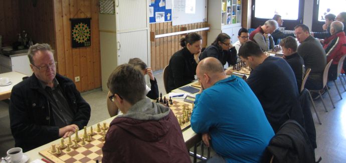 Kurze Zeit später musste Emir bereits die Segel streichen (0:2), die Partien von Wolfgang und Kay kippten darüber hinaus leider auch nicht mehr in unsere Richtung. Michaels Partie bot einige taktische Feinheiten auf beiden Seiten, Jasmin und Pascal gelang es, ihre Stellung nach und nach zu verbessern. Ich konnte aus dem Mittelspiel in ein für mich aktiveres Endspiel mit vier Türmen und etlichen Bauern abwickeln, ohne, dass ich einen Gewinnweg gesehen habe. Im weiteren Verlauf des Mannschaftskampfes gingen die Partien von Wolfgang und Kay verloren, Jasmin konnte immerhin einen Punkt für uns einfahren. Ein von ihr sehr souverän und sauber gespieltes Match. 1:4.