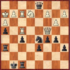 IM Ruslan Kurayan (2376) mit Schwarz hatte gerade 38. ... b5 gespielt. Marcy entschied sich für 39. Tg4+ und musste nach Kh7 die Hand reichen. Zum Remis gereicht hätte 39. Txf5!! bxc4 40. Txf8+ Kg7 41. T2f7+ Kg6 42. Sf4+ Sxf4 und gegen die Schachgebote der weißen Türme auf der f-Linie gibt es für Schwarz kein Entkommen. Doppelt bitter für Marcy, der eine starke Partie gespielt hatte und keinen Klassenunterschied erkennen ließ.