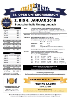 In der ersten Januarwoche, vom 2. bis 6. Januar 2018 wird zum 35. Mal das Open in Untergrombach  ausgetragen. Das A-Open wird ELO-gewertet. Es ist ab sofort möglich sich online für das Turnier anzumelden. Die vorläufigen Teilnehmerlisten werden regelmäßig aktualisiert.