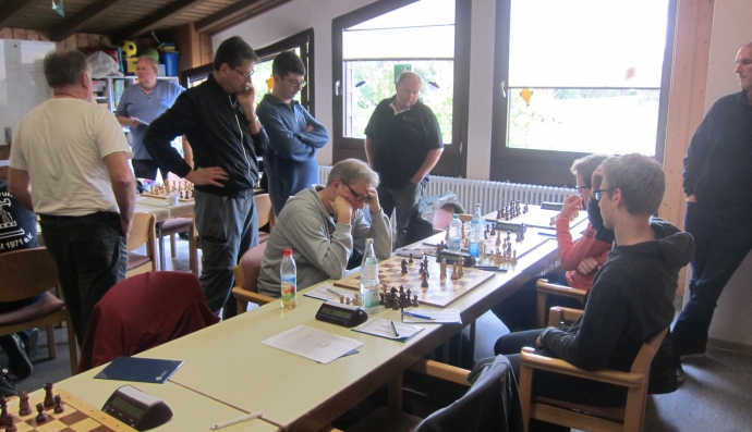 Der Kampf geht in die heiße Phase: FM Jochen Kountz (vorne) mit einem interessanten Endspiel, dahinter die Partie Veaceslav Cofman gegen Michael Spieker, in der es auf dem Brett gleich entscheidend zur Sache geht.