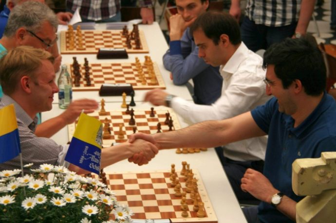 Das Highlight aus Untergrombacher Sicht: IM Oleg Spirin (SC Untergrombach) kämpft am Brett 1 gegen Ex-Weltmeister GM Vladimir Kramnik (Foto mit freundlicher Genehmigung von Klaus-Peter Thronicke)