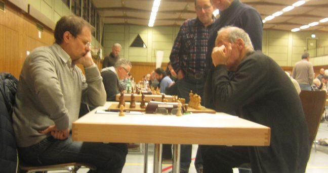 GM Vyacheslav Ikonnikov (links), Schachgroßmeister aus Rußland und zuletzt zweimal Sieger des Turniers in Untergrombach: Ihm gelang ein äußert lehrreicher Auftaktsieg mit den schwarzen Steinen gegen Bernd Giacomelli (SK Durlach).