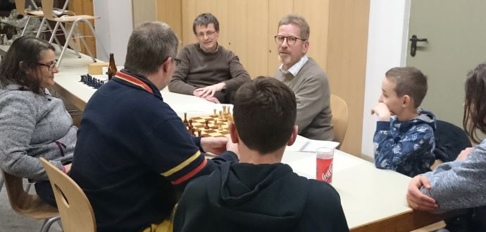 Im Rahmen der Serie "Training mit dem Meister" war Untergrombachs Oberligaspieler FM Dr. Joachim Sieglen im Einsatz und erklärte den anwesenden Mitgliedern den Minoritätsangriff - ein wichtiges strategisches Element das in Bauernstrukturen einiger gängiger Eröffnungen entstehen kann. Zur Einleitung gab es eine Positionspartie zwischen Kotov und Pachmann, in der sehr schön ersichtlich wurde, wie man gegen den aus dem Minoritätsangriff entstehenden hängenden Bauern vorgehen kann. Anschließend wurden die üblichen Verteidigungsmechanismen am Beispiel des abgelehnten Damengambits erläutert: Verschiedene Bauernmanöver gegen den Vorstoß: Spiel mit dem Isolani, Spiel mit einem entfernten Freibauern und - was bei den Trainingsteilnehmern am Besten ankam - Verteidigung durch aktives Figurenspiel am Königsflügel (Gegenangriff). Die Lektion war sehr tiefgehend, umfangreich und sehr gut vorbereitet und wurde zudem äußerst kompetent und verständlich vorgetragen. Ein echter Gewinn für alle Teilnehmer!