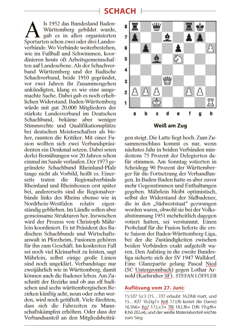 Beim Heimspieltag in der abgelaufenen Saison Oberliga Baden-Württemberg gelang Untergrombachs Pascal Nied eine spektakuläre Opfer-Kombination gegen den gestandenen Internationalen Meister Lothar Arnold. Wir haben diese sensationelle Partie bereits in unserer Berichterstattung zum neunten Spieltag ausführlich gewürdigt. Nun widmet Deutschlands bekanntester Schachjournalist Stefan Löffler diesem Glanzlicht ein Platz in der heute erscheinenden Schachkolumne der hoch angesehenen Frankfurter Allgemeinen Zeitung.