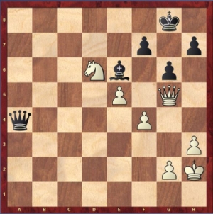 GM Bojkov hatte mit Weiß eine wenig gespielte Variante in der Italienischen Eröffnung gewählt. Aus der Eröffnung konnte er nichts herausholen, jedoch kurz vor der Zeitkontrolle konnte er sich einen kleinen Vorteil erarbeiten, an dem er festhalten und ihn sogar Schritt für Schritt ausbauen konnte. Der Rechner hat die folgende Stellung bereits bei +2, als Schwarz im 46. Zug mit Da4?? die Partie abrupt beendete. Der Zug lässt eine tödliche Angriffskomsbination für Weiß zu, welche?