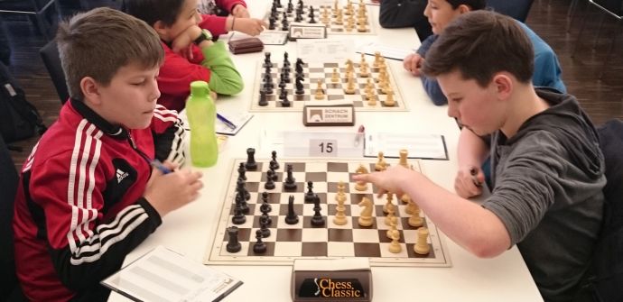 Das zweite Untergrombacher Geschwisterpaar war Marc und Luca Toth, die aufgrund ihrer Spielstärke beide im A-Turnier gesetzt waren. Wie Pascal würden sie hauptsächlich stärkere Gegner bekommen. Beide begannen am Samstag parallel mit Auftaktniederlagen gegen klar bessere Spieler; Marc hatte gleich den späteren Turniersieger Linus Koll als Gegner und hielt den Laden fast 40 Züge zusammen, eher er dann mit einem schwer zu sehenden taktischen Versehen die Partie herschenkte. In Runde 2 ließ Marc einen Pflichtsieg folgen, Luca überraschte mit Sieg gegen Tobias Kiefhaber (KSF) in einer ganz stark geführten Partie. Besonders im Endspiel zeigten sich die ersten Früchte des Intensivtrainings durch Stefan Doll. Über ein übersehenes Mattmotiv kann man daher auch getrost hinwegsehen. In Runde drei wieder alles parallel; zu starke Gegner, in dem Fall für beide Gegnerinnen und konsequent auch Niederlagen. Am Sonntag "same procedure as every round", beide hatten Gegnerinnen, für Marc war ein Sieg Pflicht, für Luca wäre es eher eine Überraschung. Beide hatten verlorene Stellungen auf dem Brett, beide durften sich bei ihren Gegnerinnen für taktische Versehen bedanken und fuhren den Punkt ein. Erst in der letzten Runde trennten sich die Wege der beiden Brüder, Luca kam in einer Kurzpartie gegen den von seinem Freitagstrainer Veaceslav Cofman trainierten Hendrik Hänselmann (KSF) böse unter die Räder. Eine Partie, die Luca so schnell nicht vergessen wird. Bereits nach zehn Zügen war Schluss, eine bittere Lektion für das kleine Talent gegen ein noch größeres gleichaltriges Talent. Marc hingegen hatte es mit Julius Kiefhaber zu tun, der noch vor der Parte siegesgewiss "den mach ich platt" tönte. Am Ende wurde es dann eine sehr einseitige Vorstellung: Marc war hochkonzentriert und wollte unbedingt das Turnier zu einem guten Abschluss bringen. Er gewann in einer seiner bislang besten Partien überzeugend und landete mit 3 aus 5 auf dem insgesamt 23. Rang, neue DWZ jetzt 1226. Luca verbesserte sich auf 1146 und ist jetzt deutschlandweit in der Top 40 in seiner Altersklasse.