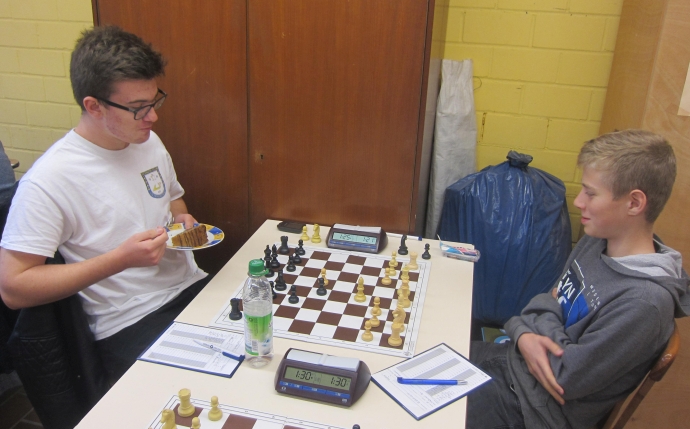 Hat die Ruhe weg: Alexander Doll (links) ruht äußerlich wie innerlich in sich selbst und genießt seine Partie bei einem Stück Kuchen. Gegner Tim Wellenreich ruht ebenfalls in sich selbst, nur ohne Kuchen.