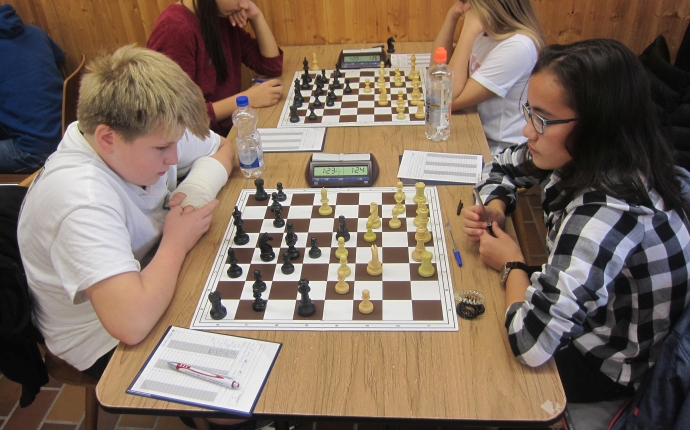 Der einzige Untergrombacher Titelträger im Turnier: KM Simon Kling, hier links am Brett gegen Dana Chung (KSF). Gleich wird er ohne Zwang eine Figur opfern, was in dieser Stellung und gegen diese Gegnerin keine gute Idee war. Dennoch: Sein furchtloses Spiel macht einfach Freude.