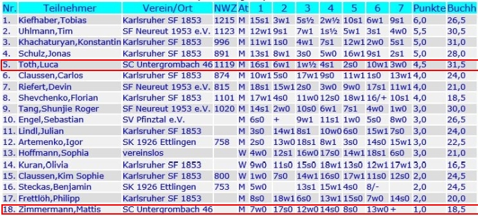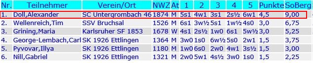 In der U16 war Top-Talent Alexander Doll (1874) absoluter Titelfavorit und er zeigte im Turnierverlauf auch, dass er zurecht auf Rang 1 der Setzliste stand. Vier Siege und lediglich ein Remis gegen den Bruchsaler Wellenreich sprechen eine deutliche Sprache. Alexander entwickelt sich weiterhin prächtig, spielt in der Landesliga am Brett neben dem Vater und wir sind alle gespannt, was er noch an Taten auf dem Brett folgen lässt. Fürs Erste ist er Bezirksmeister U16 Karlsruhe und damit natürlich für die Badische Meisterschaft qualifiziert.