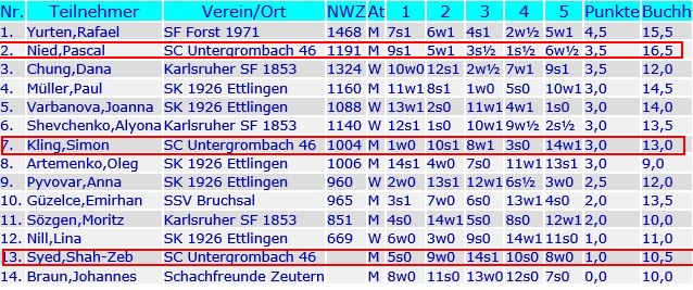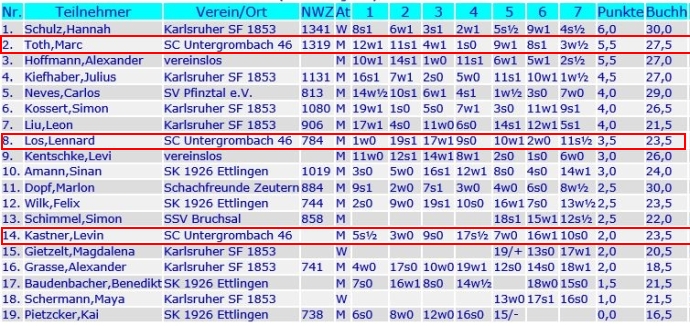 Mit dem sportlichen Abschneiden auf dieser Bezirksmeisterschaft können wir sehr zufrieden sein. In der Breite waren wir mit neun Spielern sehr gut aufgestellt, wenn nur Ausrichter Ettlingen und die großen KSF mehr Spielen entsenden als wir, spricht das für uns. In der Spitze lief es auch sehr gut, der Titel von Alexander Doll (U16) und die beiden zweiten Plätze von Pascal Nied (U14) und Marc Toth (U12) erfüllen uns mit Stolz. Auch das Abschneiden von Lennard Los und Simon Kling muss positiv hervorgehoben werden und Levin Kastners Schach macht Lust auf mehr.