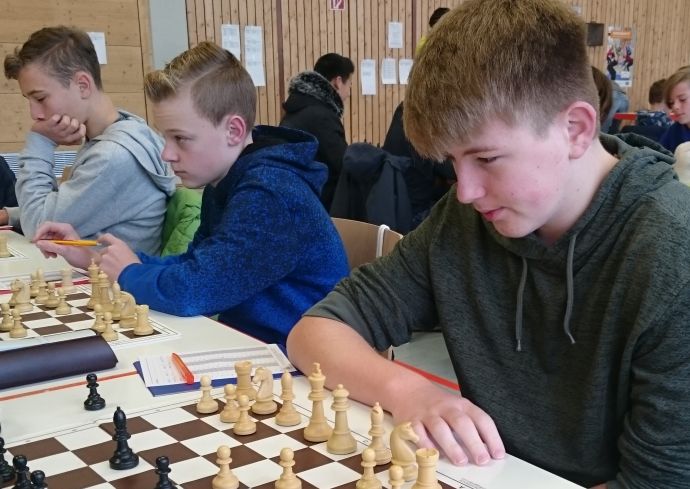 In der U16 hatte überraschend die Untergrombacher Nummer 1 Pascal Nied nachgemeldet, obwohl dieser fürs Open Untergrombach plant. Damit hatte die Setzliste einen Favoriten, aber mit Erik Eberhart aus Bruchsal war starke Konkurrenz da. Und so kam es, beide Spieler gewannen vier Partien und remisierten in einer packenden Begegnung miteinander. Auch hier musste laut Reglement gestochen werden und Pascal Nied gewann im Schnellschach mit 1,5:0,5 - gleich die Auftaktpartie mit Weiß hatte er gewonnen und konnte dann in der zweiten Partie in Gewinnstellung ein Remis annehmen.