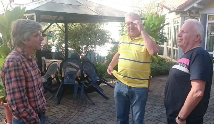 FM Thomas Raupp und FM Hans-Joachim Vatter genießen das gute Wetter nach ihrem Kurzremis zu Auftakt. In der Mitte: IM Christian Maier.