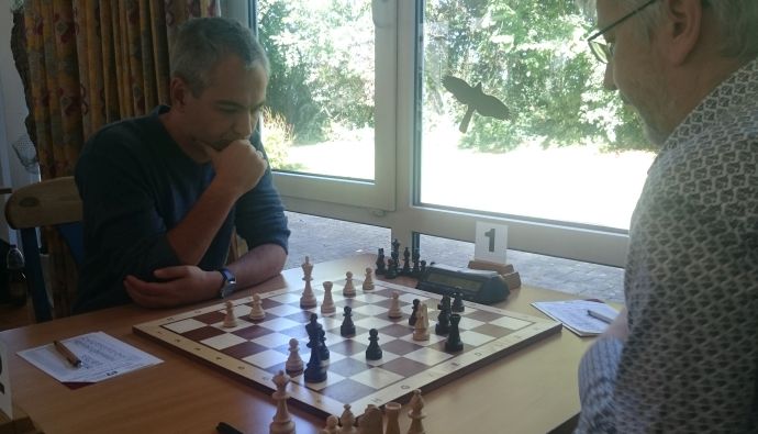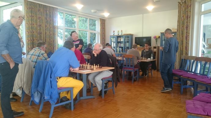 Am dritten Brett traf der Untergrombacher Mannschaftsführer IM Heinz Fuchs auf seinen alten Kollegen IM Christian Maier. Hier dauerte es etwas länger, aber auch diese beiden alten Weggefährten einigten sich letztlich auf Remis und duellierten sich anschließend beim Blitzschach an der frischen Luft. 1:1 also zum Auftakt.