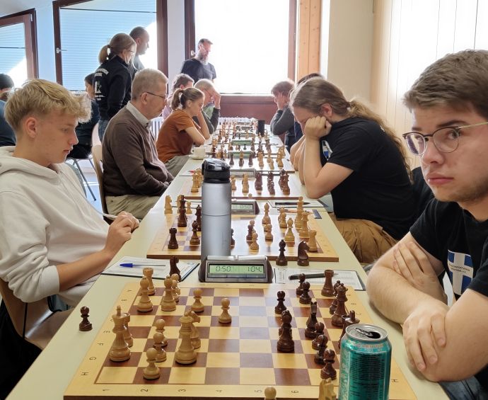 Als erstes ging völlig überraschend die Partie von Andre Hayen verloren. Hayen hatte sich unter anderem sorgfältig auf seine Gegnerin Jenni Wellenreich vorbereitet und kam mit kleinem Vorteil mit Schwarz aus der Eröffnung ins Spiel. Im zwanzigsten Zug begann er heftig den Kopf zu schütteln und meinte, in eine gegnerische Falle getappt zu sein und entschied sich nach einigem Nachdenken zu einem passiven Rückzug, um fortan die Trümmer seiner Stellung zu verwalten. Angemessen wäre eine geradlinige Fortsetzung seines bis dahin starken Spiels gewesen und er hätte seinen kleinen Vorteil behaupten können. Schade, dass er sich durch den weißen Bluff hat ins Bockshorn jagen lassen, nach dem passiven Rückzug folgte direkt ein Figureneinsteller und damit war die Partie gelaufen. Eindeutig ein psychologischer Sieg für die Bruchsaler Spielerin und eine großartige Gelegenheit für Andre Hayen, eine ganz wichtige Lektion für die Zukunft mitzunehmen.