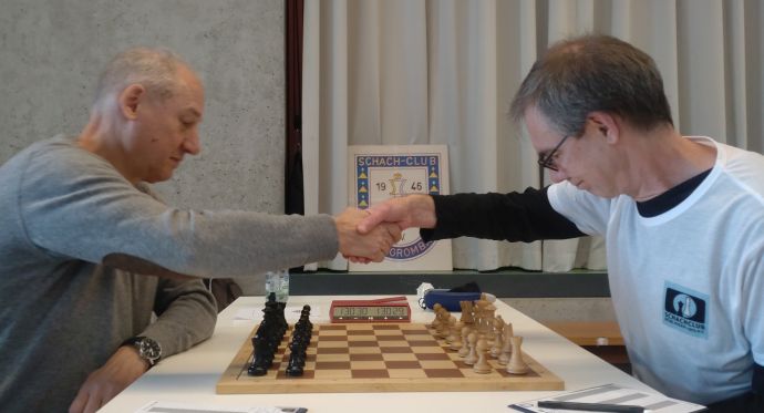 Bei diesem Spielstand fiel es Mannschaftskapitän IM Heinz Fuchs leicht, in eine Punkteteilung einzuwilligen. Mit Schwarz baute sich IM Fuchs gegen die Réti-Eröffnung ultrasolide auf und ließ nichts anbrennen. Nach zwanzig Zügen war eine noch spielbare, objektiv ausgeglichene Stellung auf dem Brett und aufgrund beiderseitig hohen Zeitverbrauchs einigten sich die Spieler auf Unentschieden zum neuen Zwischenstand 2,5:0,5 für Untergrombach.