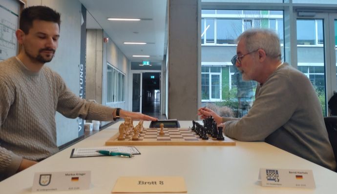 Oliver Günthner (Weiß) und FM Jochen Kountz einigten sich auf ein frühes Remis.