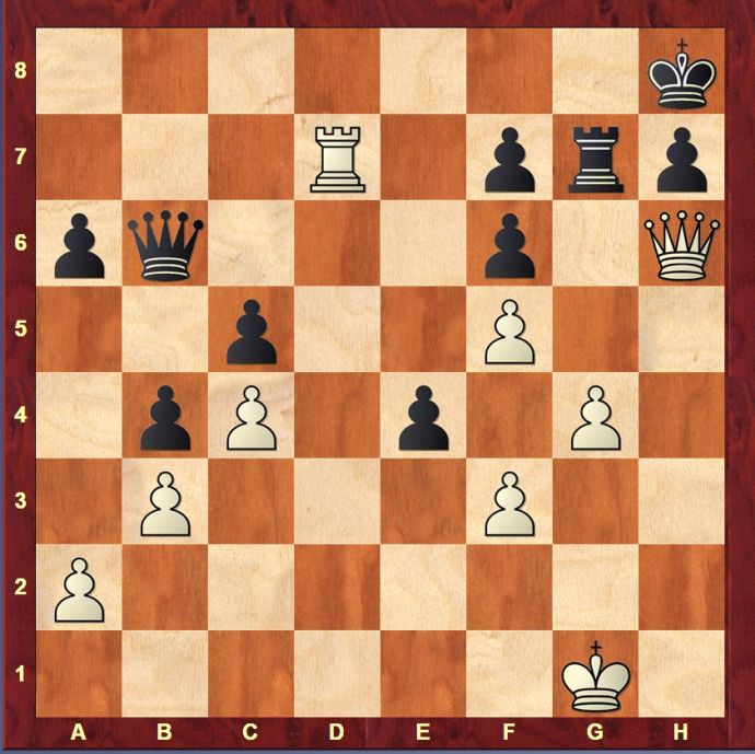 Jeder weiß, dass Züge, die im Moment der Zeitkontrollen (40. Zug) gemacht werden, genauerer Untersuchung verlangen. Aber 40. ... Tg7 war so natürlich und selbst GM David Baramidze mit ELO 2600 war so überzeugt von dem Zug, dass er in der Folge entspannt im Spiellokal auf und ab spazierte. Die bittere Wahrheit ist, dass Weiß nach den simplen und ruhigen 41. Kf2 !! komplett und unabwendbar auf Gewinn steht, weil gegen das folgende g5! kein Kraut gewachsen ist. Aber selbst der abgebrühte GM Solodovnichenko ließ sich beeindrucken und wählte 41. fxe4 und die Partie endete folgrerichtig in Unentschieden.