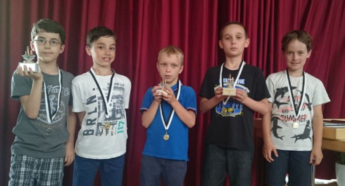 Mit 5 aus 7 Punkten holte Levin Uyar den Pokal für den ersten Platz der zweiten Klassen. Sein Ergebnis war umso bemerkenswerter, da er am Vorabend mit Fieber im Bett lag und auszufallen drohte. Am nächsten Morgen aber war das Fieber weg und Levin wollte unbedingt spielen - es hat sich gelohnt. Nur gegen Jonas Schulz und Luca Toth unterlag er.