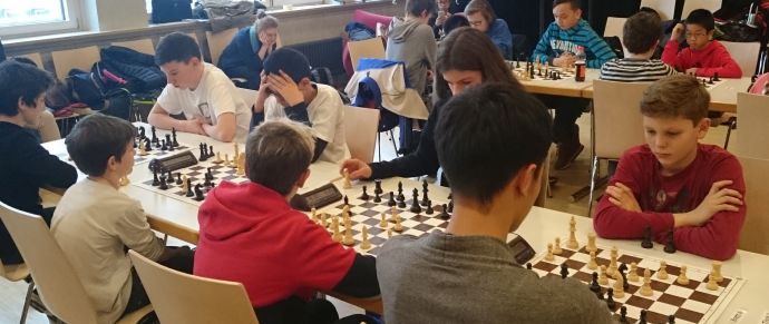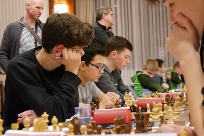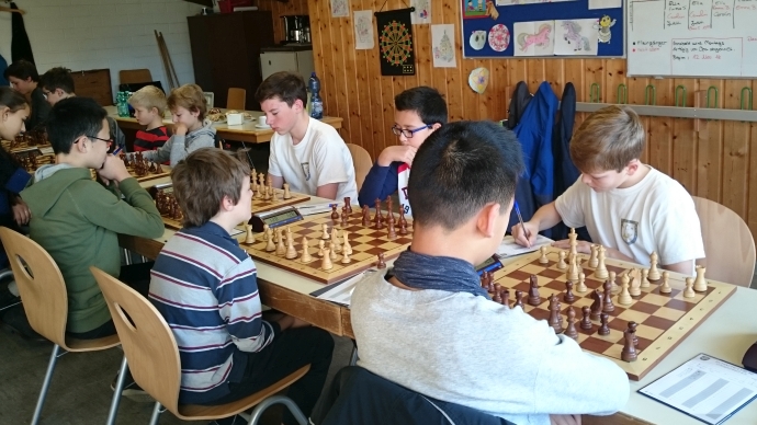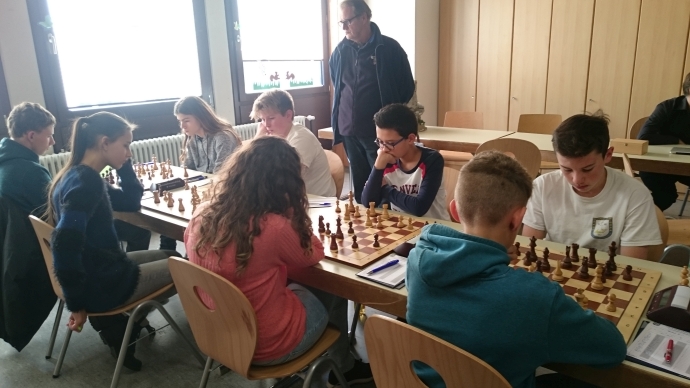 Nach einem Mittagessen in der JH ging es in die zweite Runde gegen den hoch favorisierten Gegner SG Porz. Nach einem Patzer von Simon Kling in gewonnener Stellung und einer unglücklichen Niederlage von Pascal Nied an Brett 1 verloren wir knapp mit 1,5:2,5, haben aber gezeigt, dass wir auch gegen auf dem Papier bessere Gegner mithalten können.