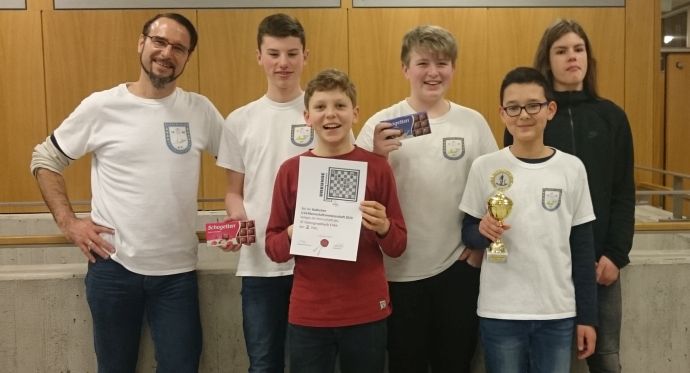 Die U14 des SCU: Jugendleiter Ralf Toth, Pascal Nied (Brett 1), Tim Burger (Brett 3 bis 5), Simon Kling (Brett 3 bis 5), Simon Richter (Brett 3 bis 5) und Marc Toth (Brett 2): Qualifikation in der letzten Runde geschafft!