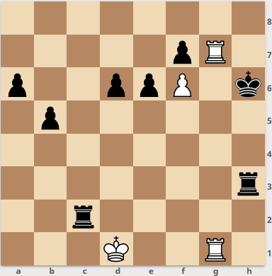 Schwarz (Freiburg) entschied sich, kein weißes Gegenspiel zuzulassen und deckte den Bauer f7 mittels 39. ... Tc7?? und musste nach 40. Tg8! solch eine Stellung sogar noch aufgeben. Der Wahnsinn war perfekt!