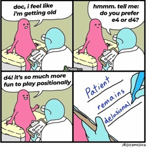 - An mich selbst, da ich nun wohl endgültig in den Kreis der Greise aufgestiegen bin. Getreu dem Motto „man ist (…) so alt, wie man sich fühlt“, habe ich mich dazu entschieden, erstmalig mit d4 zu eröffnen.