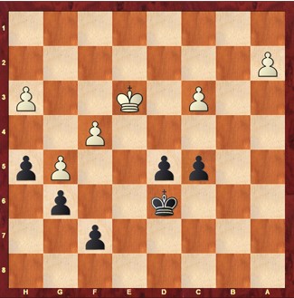 Abbildung 1: Weiß zieht f5 und verliert, da sein König den f- und den entstehenden d-Bauern nicht aufhalten kann, während Levin mit seinem Monarchen rechtzeitig zum Damenflügel eilt.