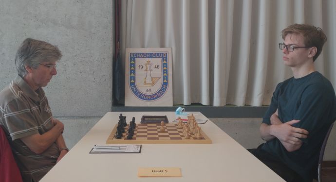 FM Dr. Joachim Sieglen löste eine schwere Aufgabe souverän: Gegen GM Zigurds Lanka musste sich der Untergrombacher über hundert Züge lang hartnäckig verteidigen. Erst kurz vor Spielbeginn erfuhr Dr. Sieglen, dass er an Brett 3 statt an Brett 4 ran muss.