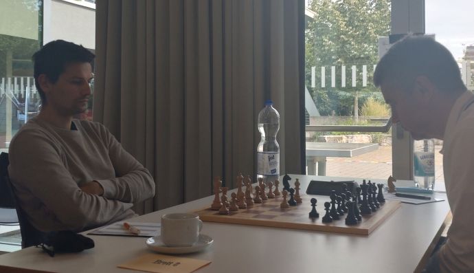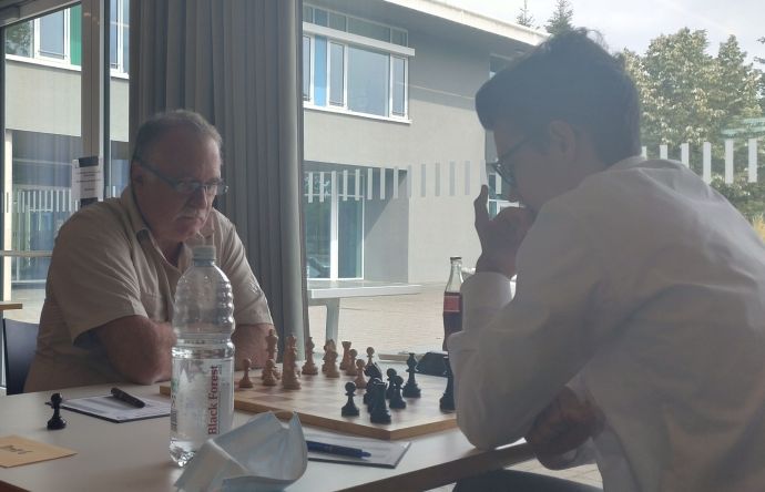 IM Heinz Fuchs (links) hatte einen schweren Stand gegen seinen rund 300 ELO-Punkte stärkeren Gegner GM Tarlev