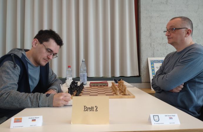 Die einzige Untergrombacher Niederlage an diesem Tag setzte es am zweiten Brett, wo GM Davor Rogic zunächst planvoll gegen den rückständigen Bauern in der Sweshnikov-Variante der Sizilianischen Verteidigung vorging. Dabei handelte er sich jedoch einen Doppelbauern ein, der ihm später zum Verhängnis werden sollte. Schwarz spielte clever und geduldig, deckte zunächst alle Drohungen auf der halboffenen d-LInie ab und wurde im Endpiel am Königsflügel aktiv. Große Probleme bereitete der inaktive weiße Läufer auf c2. Stark gespielt von Schwarz und verdient den Punkt eingefahren.