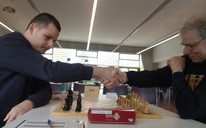 Auch am siebten Brett wurden die Punkte geteilt. Hier hatte es der nach Wertungszahl klar unterlegene Gästespieler darauf angelegt, mit Weiß über zahlreiche forcierte Abtäusche nichts zuzulassen und ohne eigene Gewinnversuche in den Remishafen zu steuern. Legitim und gut gemacht, das musste auch Untergrombachs FM Bernd Schneider neidlos anerkennen.