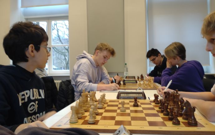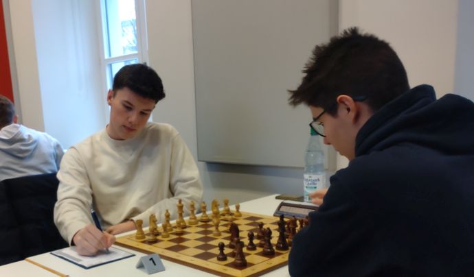 Die Bretter 2 und 3: Im Vordergrund Levin Uyar am dritten Brett, dahinter Andre Hayen, der bequem remisierte.