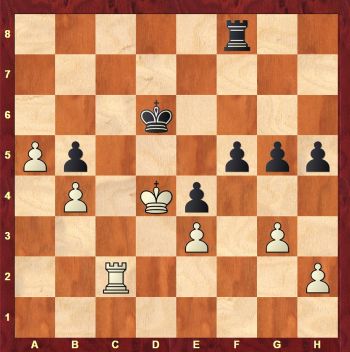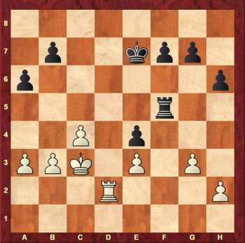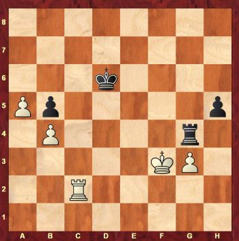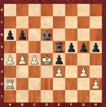 Weiß hat drei gegen zwei Bauern am Damenflügel, aber bei korrekter schwarzer Verteidigung ist die Stellung remis. Schwarz entschied sich, den Turm auf der fünften Reihe zu halten und einige Züge später kam es zu folgender Stellung:
