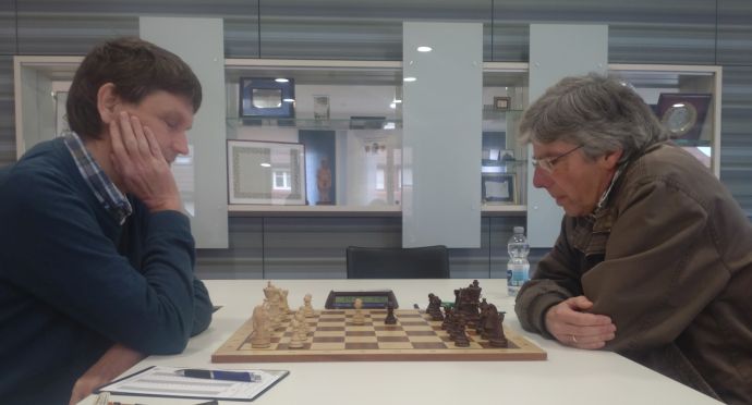 FM Jochen Kountz und Klaus Riehle erspielten ein dem Partieverlauf entsprechend gerechtes Unentschieden.