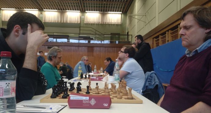 Zur Stunde spielen an Brett 1 FM Veaceslav Cofmann (Eppingen) mit Weiß gegen GM Vyacheslav Ikonnikov (Bad Mergentheim).
