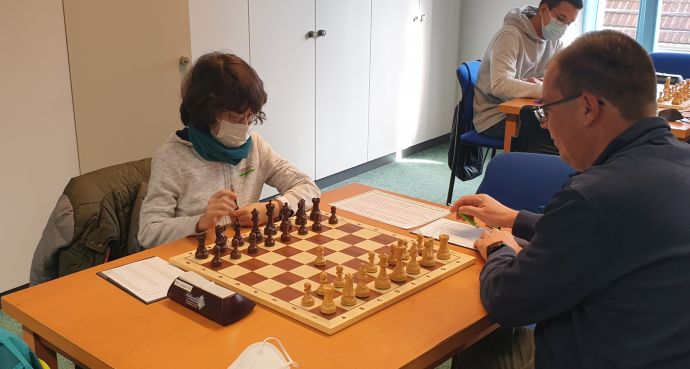 Als nächstes Ergebnis trudelte das erwartete Remis am Brett von Kay Hayen ein. Er hatte Katalanisch gespielt und diese Eröffnung gezielt so gespielt, das nichts passieren konnte. Sein Versuch einen Minoritätsangriff zu kriegen, konnte Schwarz verhindern und danach war die Luft raus. Beim Stand von 3,5:2,5 kam es zur Entscheidung am Spitzenbrett.