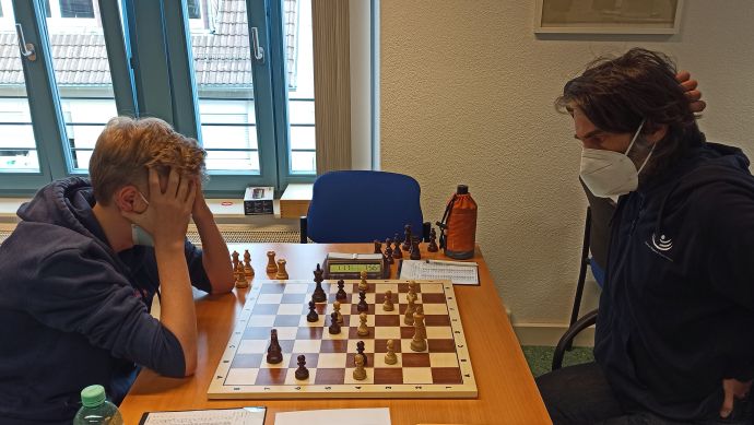 Die nächste Entscheidung gab es am Brett von Luca Toth. Sein erfahrener Gegner verwirrte ihn, in dem er ihn auf ein Dame-Schach von Luca mit dem König ins Zentrum lief, statt das Schach mit einer Figur abzudecken. Nach dieser irren Aktion stand Luca klar auf Gewinn. Statt zu rochieren und die entstandene Gewinnstellung zu genießen, versuchte Toth Taktiken, die nicht funktionierten und nur wieder den Durlacher begünstigten. Einmal im Vorteil, ließ dieser sich die Butter nicht mehr vom Brot nehmen. Ganz klar ein verschenkter Punkt, hier wäre viel mehr drin gewesen!
