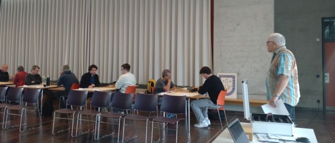 Der Auftakt der Begegnung Untergrombach - Pforzheim mit FSR Dr. Kleifges, der praktischerweise in Untergrombach wohnt, aber für den SK Durlach gemeldet ist