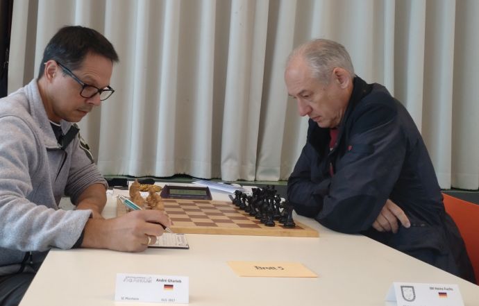 Nach verheißungsvollem Auftakt trennten sich André Gharieb und IM Heinz Fuchs leider viel zu früh mit Remis.