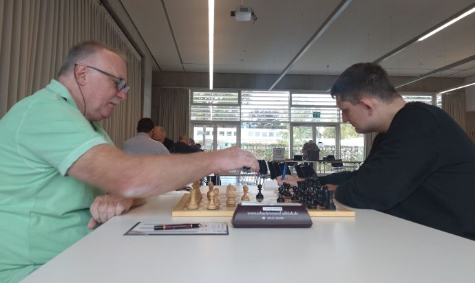FM Bernd Schneider (Weiß) hat oft genug bewiesen, dass er am Brett keine Furcht kennt. Gegen Stefan Schork endete eine spektakuläre Angriffspartie überraschend unentschieden.