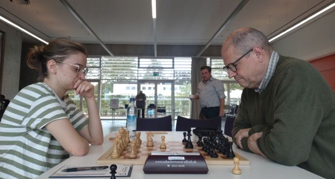 Die anderen Partien gingen ausnahmslos über die volle Distanz und erreichten allesamt die Zeitkontrolle. Das nächste Ergebnis war aus Untergrombacher Sicht sehr positiv, Rebecca Doll war es gelungen, ihre Stellung am achten Brett gegen den Pforzheimer Vereinsvorsitzenden Dr. Christoph Mährlein Remis zu halten. Gegen dessen Skandinavische Verteidigung war nach fünf (!) Zügen Ende mit Theorie und das Spiel wurde umgehend brutal scharf auf des Messers Schneide. Um einen Bauernverlust zu vermeiden, gab Rebecca Doll die Dame für Turm und Läufer. Es entstand eine klare Gewinnstellung für Schwarz, aber Doll verteidigte hartnäckig. Nach einigem Hin und Her und etlichen ungenauen Zügen auf beiden Seiten war tatsächlich ein Endspiel enstanden, das für Schwarz nicht mehr zu gewinnen war und man teilte die Punkte.