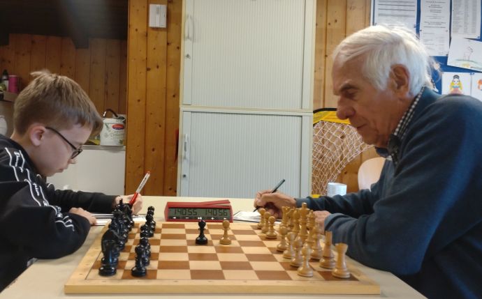 Den Schlusspunkt setzte der Berichterstatter Ralf Toth. In einem Duell zweier gleich starker Spieler rochierte der Untergrombacher in der Alapin-Variante der Sizilianischen Verteidigung mit Schwarz lang und hatte Glück, dass Weiß ein vorteilhaftes Bauernopfer vermeiden wollte und sich einen isolierten Doppelbauer auf der f-Linie einhandelte. Schwarz war nun im Vorteil, aber Weiß ließ nicht locker, spielte kluge Züge drehte im Mittelspiel beinahe die Partie. Beim Übergang ins Endspiel mit je einem Springer und Läufer war eigentlich jeglicher Vorteil verschwunden und die Partie lief kurz vor der Zeitkontrolle auf die Punkteteilung zu. Dann aber genügte eine einzige weiße Ungenauigkeit, Schwarz konnte Läufer gegen Springer tauschen und einen Bauern einsammeln, nun hatte der Untergrombacher Gewinnstellung. Der Gewinnweg war aber nicht leicht zu finden und erst nach über fünfzig Zügen war es dann geschafft.